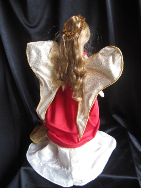 Barbie, es un hermoso ángel que lleva un conjunto monumental inspirada en los colores festivos de la temporada navideña. Su vestido rojo y dorado se acentúa con una blusa blanca , magas y una tela de distinta textura que fluye por debajo de la larga falda roja. Completa el conjunto sus delicadas ala de oro, una cinta de gargantilla y un halo brillante de oro"